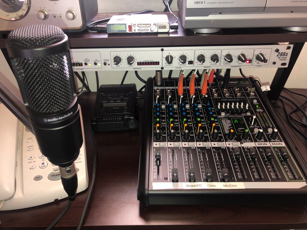 My home studio didn’t begin to take shape until 2007 when I invested in a Behringer mixer, a used compressor and a real microphone. I eventually purchased a more robust sound card. With that equipment, I recorded stories and newscasts for WNAV, WYPR and NPR.